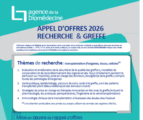 Chaque année, l’agence lance deux appels d’offres pour financer des études et projets de recherche. L’AOR « Recherche et Greffe » concerne les projets cliniques et scientifiques, tandis que l’AOR « Sciences humaines et sociales » concerne les projets relevant de toutes les disciplines des Sciences humaines et sociales appliquées aux domaines de compétences de l’Agence (incluant le don et la greffe de CSH). Ces initiatives s’inscrivent dans le cadre des missions de l’Agence, définies par les lois de bioéthique, et sont rendues possibles grâce à un budget voté par son Conseil d’administration. Les thèmes de recherche, définis après avis du Comité scientifique concerné et du Conseil d’orientation, couvrent des enjeux essentiels pour améliorer la qualité, la sécurité et l’accès aux greffes, ainsi que pour promouvoir l’innovation dans le domaine de la transplantation.